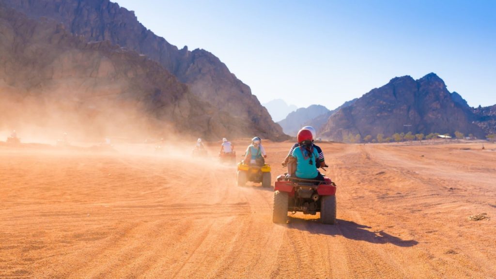 السفاري. تبدأ هذه الرحلة الممتعة اولا بالسيارات الجيب التي تذهب بنا الى عمق الصحراء ثم بعد ذلك بالموتسيكلات الرباعية العجلات. اثناء الرحلة بالطبع سنشاهد السراب الصحراوي الشهير و نغوص في عالم الرمال اللامتناهي و لاتنسوا ايضا جولتنا على ظهر الجمل سفينة الصحراء اما بعد تناول العشاء فسنستمتع بالعروض الفنية المختلفة و منها رقصة التنورة و الرقص الشرقي الشهير. انه عالم من الخيال الموجود على ارض الواقع.