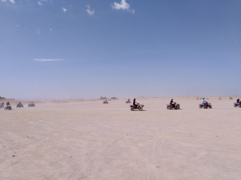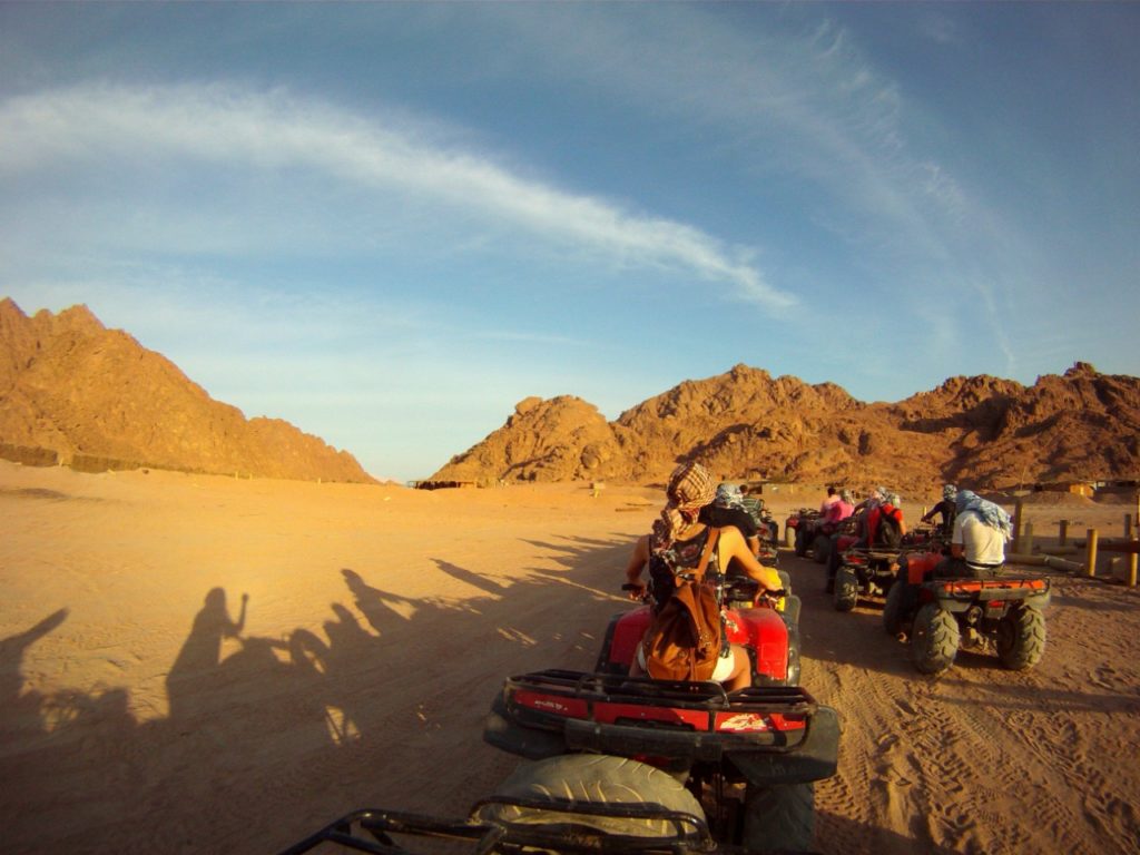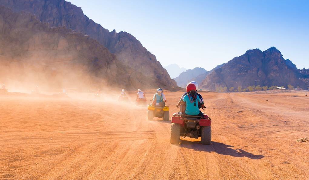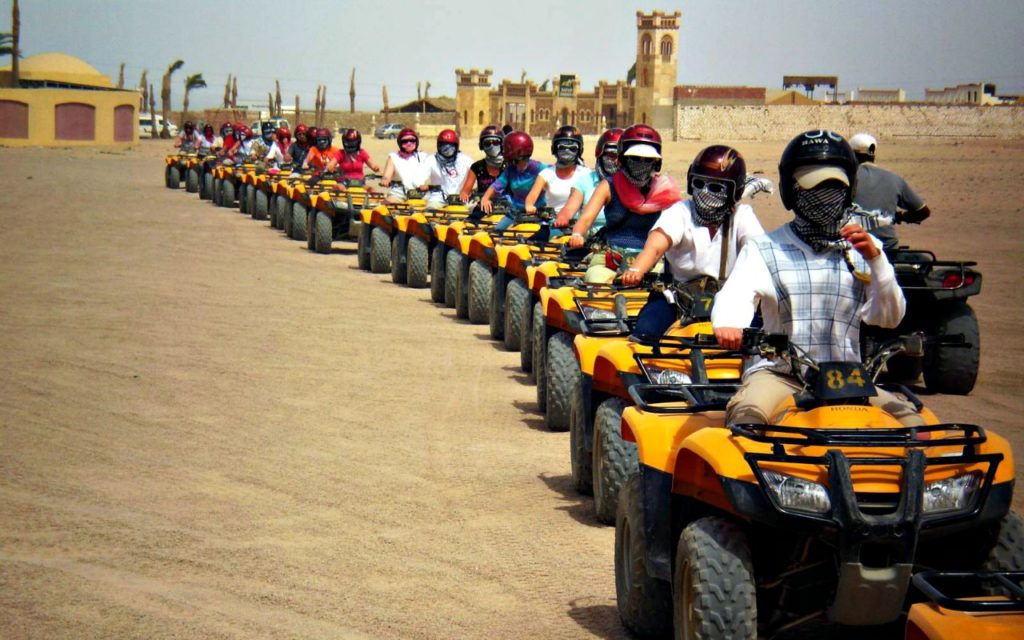 السفاري. تبدأ هذه الرحلة الممتعة اولا بالسيارات الجيب التي تذهب بنا الى عمق الصحراء ثم بعد ذلك بالموتسيكلات الرباعية العجلات. اثناء الرحلة بالطبع سنشاهد السراب الصحراوي الشهير و نغوص في عالم الرمال اللامتناهي و لاتنسوا ايضا جولتنا على ظهر الجمل سفينة الصحراء اما بعد تناول العشاء فسنستمتع بالعروض الفنية المختلفة و منها رقصة التنورة و الرقص الشرقي الشهير. انه عالم من الخيال الموجود على ارض الواقع.