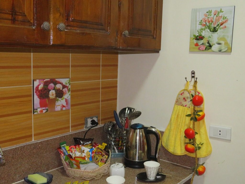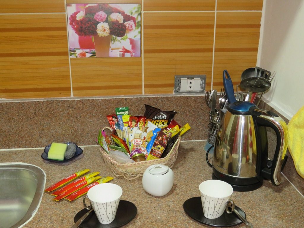 تحت تصرف العملاء الكرام مطبخ كامل التجهيزات و اطقم طعام تكفى حتى ستة اشخاص سواء من اواني و صواني و اطباق و كوبايات